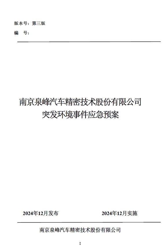 南京泉峰汽車精密技術(shù)股份有限公司突發(fā)環(huán)境事件應(yīng)急預(yù)案報(bào)告全本公示