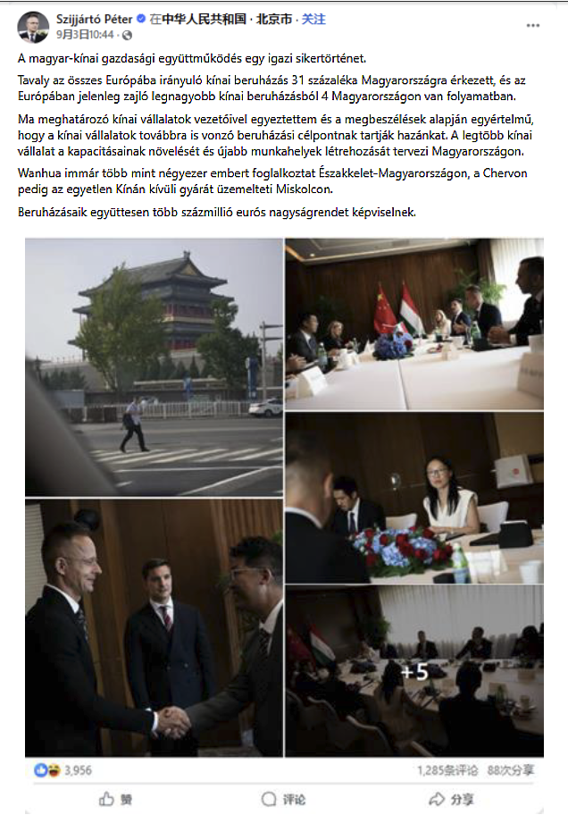 2025年9月3日,匈牙利外交與對外經(jīng)濟部長西雅爾多在北京參加完紀(jì)念中國人民抗日戰(zhàn)爭暨世界反法西斯戰(zhàn)爭勝利80周年閱兵活動后,同在匈牙利投資的中國主要公司領(lǐng)導(dǎo)人進行了會談。